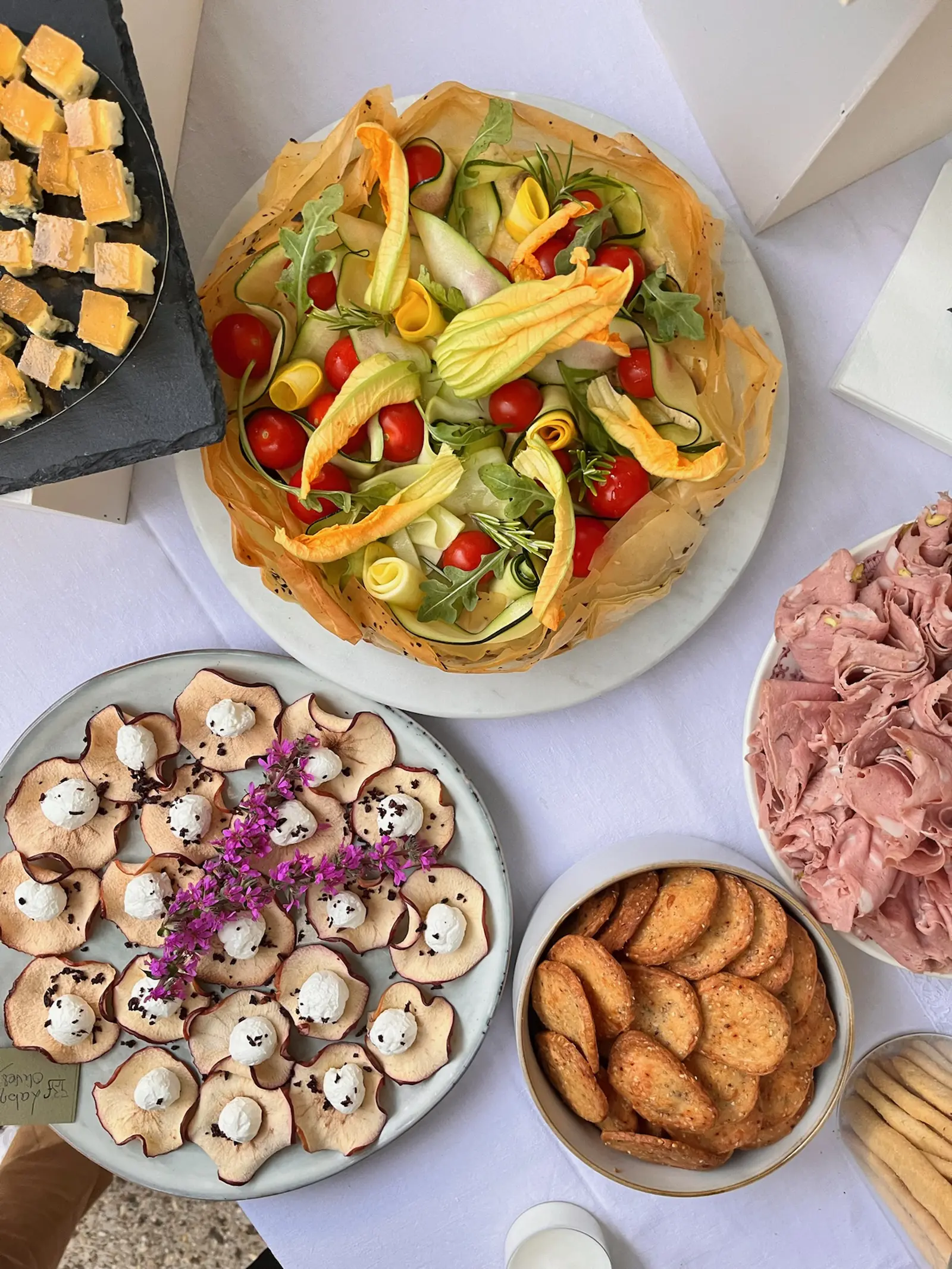 Au programme : focaccia Stracciatella courgettes menthe, bruschette vitello tonnato, gorgonzola & prosciutto, ricotta salata…